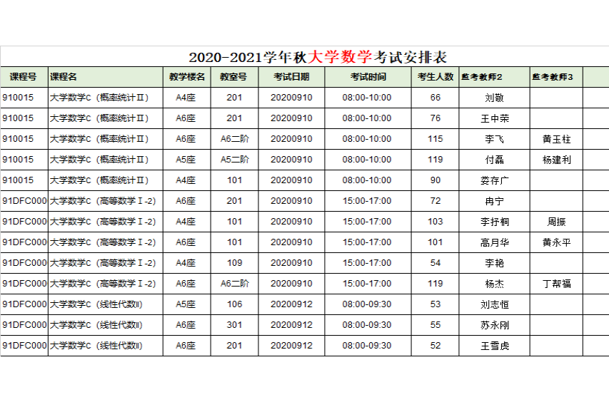 补缓考公共数学、大学计算机考场安排表(时间有调整)及考生座次表(见附件3)。